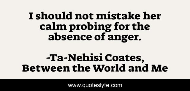 This page presents the quote "I should not mistake her calm probing for the absence of anger.". Author of this quote is Ta-Nehisi Coates, Between the World and Me. This quote is about emotion, self-discipline, discipleship, detachment,.