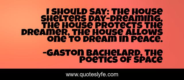 This page presents the quote "I should say: the house shelters day-dreaming, the house protects the dreamer, the house allows one to dream in peace.". Author of this quote is Gaston Bachelard, The Poetics of Space. This quote is about house, privacy, dream, space,.