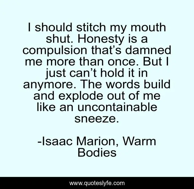 This page presents the quote "I should stitch my mouth shut. Honesty is a compulsion that’s damned me more than once. But I just can’t hold it in anymore. The words build and explode out of me like an uncontainable sneeze.". Author of this quote is Isaac Marion, Warm Bodies. .