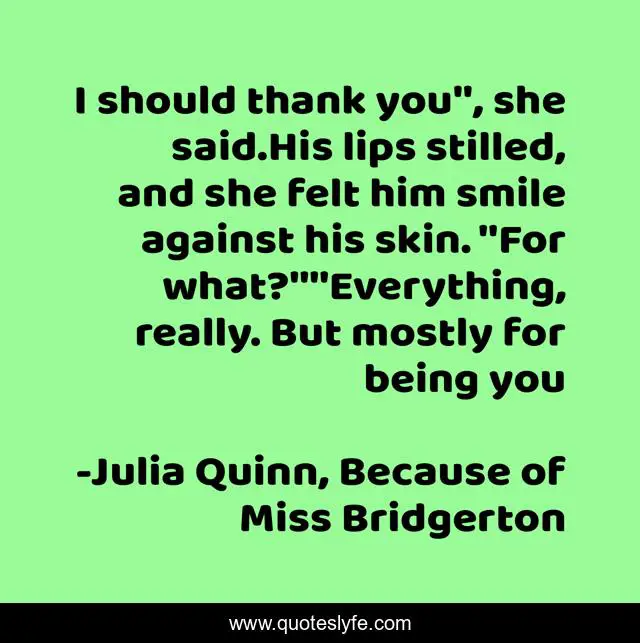 This page presents the quote "I should thank you'', she said.His lips stilled, and she felt him smile against his skin. ''For what?''''Everything, really. But mostly for being you". Author of this quote is Julia Quinn, Because of Miss Bridgerton. This quote is about greatful, love, affection, personality,.