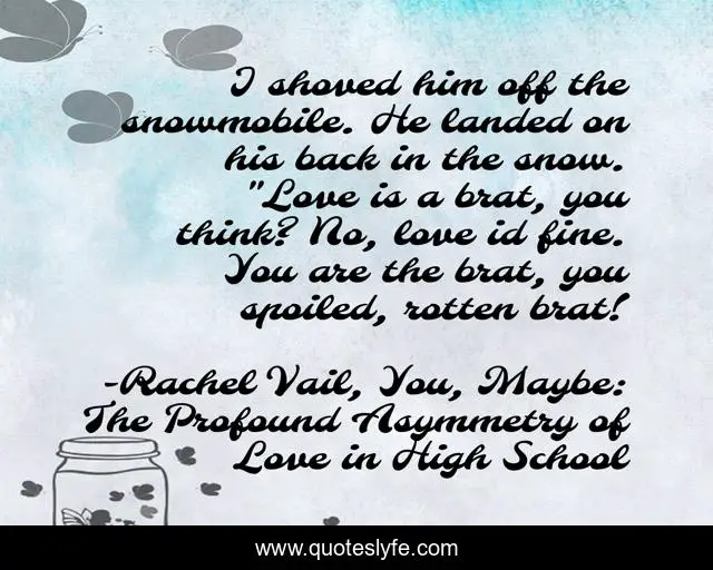 This page presents the quote "I shoved him off the snowmobile. He landed on his back in the snow. "Love is a brat, you think? No, love id fine. You are the brat, you spoiled, rotten brat!". Author of this quote is Rachel Vail, You, Maybe: The Profound Asymmetry of Love in High School. This quote is about anger, breakups,.