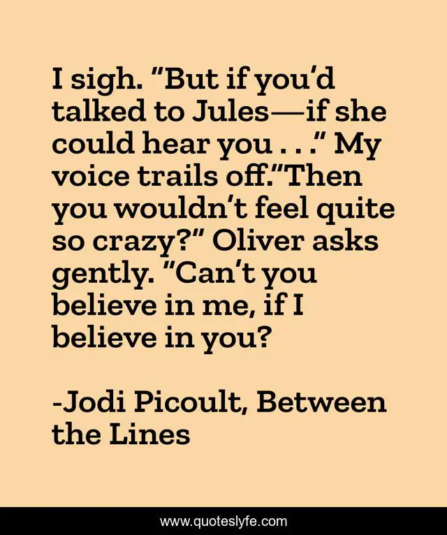 This page presents the quote "I sigh. “But if you’d talked to Jules—if she could hear you . . .” My voice trails off.“Then you wouldn’t feel quite so crazy?” Oliver asks gently. “Can’t you believe in me, if I believe in you?". Author of this quote is Jodi Picoult, Between the Lines. This quote is about oliver, belief, delilah-mcphee, between-the-lines, hearing-voices, truth,.