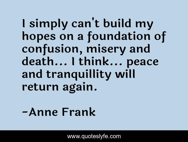 This page presents the quote "I simply can't build my hopes on a foundation of confusion, misery and death... I think... peace and tranquillity will return again.". Author of this quote is Anne Frank. This quote is about foundation, death, peace,.