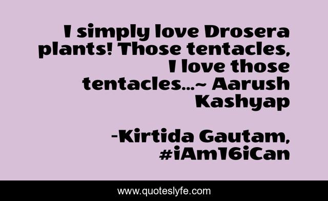 This page presents the quote "I simply love Drosera plants! Those tentacles, I love those tentacles...~ Aarush Kashyap". Author of this quote is Kirtida Gautam, #iAm16iCan. This quote is about intelligence, influence, manipulation,.