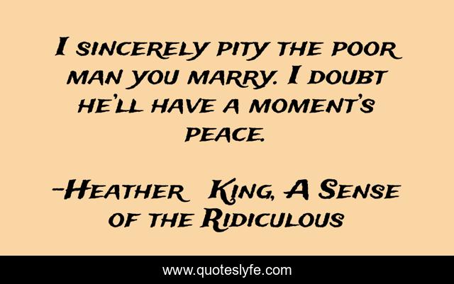 This page presents the quote "I sincerely pity the poor man you marry. I doubt he’ll have a moment’s peace.". Author of this quote is Heather King, A Sense of the Ridiculous. This quote is about regency, romance-novel, historical-romance,.