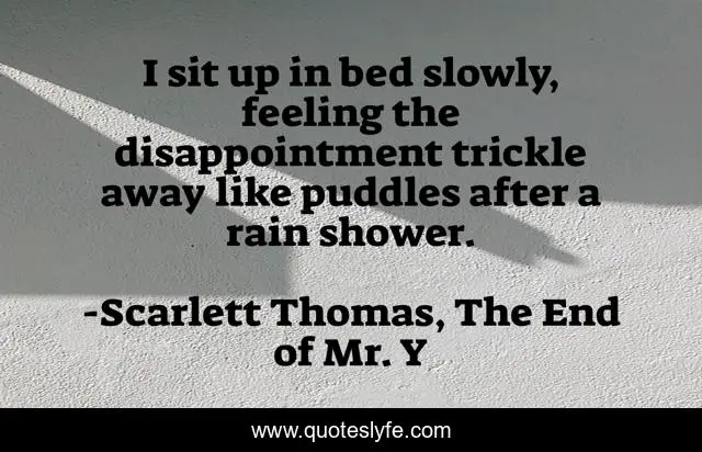 This page presents the quote "I sit up in bed slowly, feeling the disappointment trickle away like puddles after a rain shower.". Author of this quote is Scarlett Thomas, The End of Mr. Y. This quote is about anxiety, disappointment, depression, morning,.