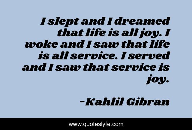 This page presents the quote "I slept and I dreamed that life is all joy. I woke and I saw that life is all service. I served and I saw that service is joy.". Author of this quote is Kahlil Gibran. This quote is about life, altruism, service, giving, joy, gibran,.
