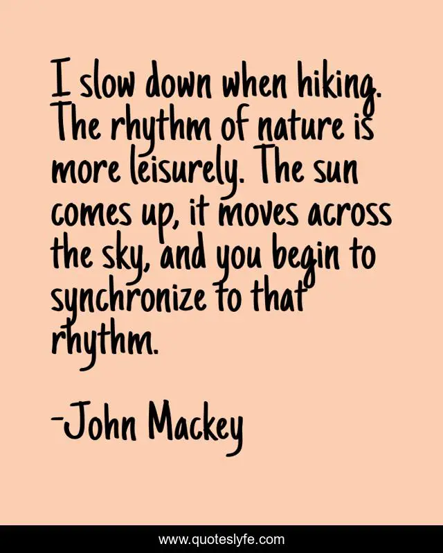 This page presents the quote "I slow down when hiking. The rhythm of nature is more leisurely. The sun comes up, it moves across the sky, and you begin to synchronize to that rhythm.". Author of this quote is John Mackey. This quote is about sun, slow, sky,.