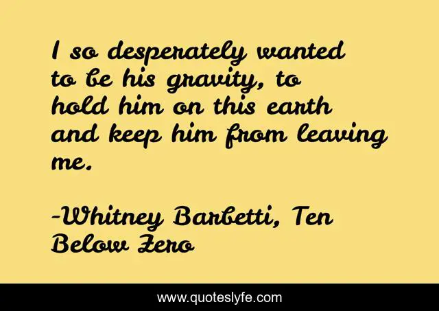 This page presents the quote "I so desperately wanted to be his gravity, to hold him on this earth and keep him from leaving me.". Author of this quote is Whitney Barbetti, Ten Below Zero. This quote is about death, love, dying, gravity, romance, lovers, affection,.