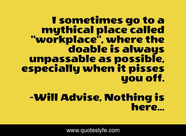 This page presents the quote "I sometimes go to a mythical place called "workplace", where the doable is always unpassable as possible, especially when it pisses you off.". Author of this quote is Will Advise, Nothing is here.... This quote is about mythical, myth, pissing-off, work, possible, place, workplace, nothing, passing,.