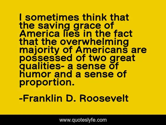 This page presents the quote "I sometimes think that the saving grace of America lies in the fact that the overwhelming majority of Americans are possessed of two great qualities- a sense of humor and a sense of proportion.". Author of this quote is Franklin D. Roosevelt. This quote is about humor, america, proportion, united-states, usa,.