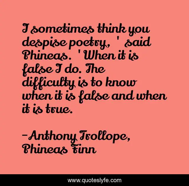 This page presents the quote "I sometimes think you despise poetry, ' said Phineas. 'When it is false I do. The difficulty is to know when it is false and when it is true.". Author of this quote is Anthony Trollope, Phineas Finn. This quote is about lady-laura, poetry,.