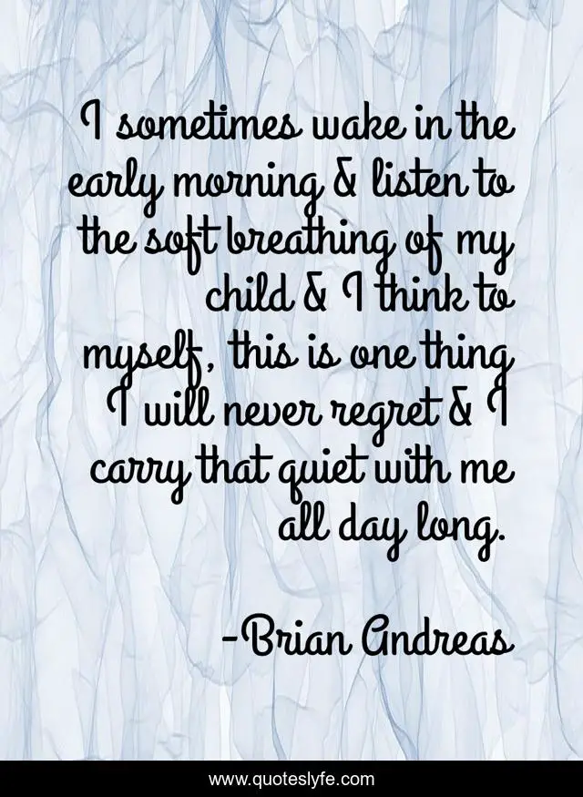 This page presents the quote "I sometimes wake in the early morning & listen to the soft breathing of my child & I think to myself, this is one thing I will never regret & I carry that quiet with me all day long.". Author of this quote is Brian Andreas. .
