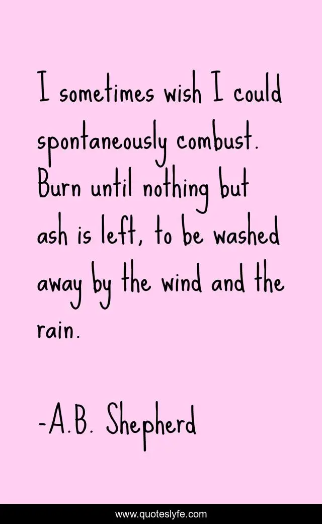 This page presents the quote "I sometimes wish I could spontaneously combust. Burn until nothing but ash is left, to be washed away by the wind and the rain.". Author of this quote is A.B. Shepherd. This quote is about sadness, despair, hopelessness, sorrow,.
