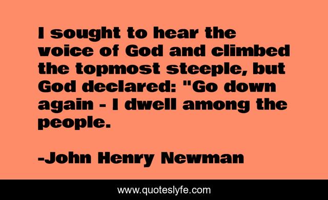 This page presents the quote "I sought to hear the voice of God and climbed the topmost steeple, but God declared: "Go down again - I dwell among the people.". Author of this quote is John Henry Newman. This quote is about god, love, inspirational, affection, enthusiasm,.