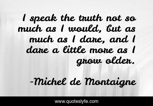 This page presents the quote "I speak the truth not so much as I would, but as much as I dare, and I dare a little more as I grow older.". Author of this quote is Michel de Montaigne. This quote is about grow, dare, speak,.