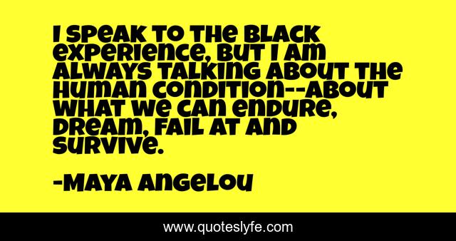 This page presents the quote "I speak to the Black experience, but I am always talking about the human condition--about what we can endure, dream, fail at and survive.". Author of this quote is Maya Angelou. .