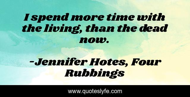 This page presents the quote "I spend more time with the living, than the dead now.". Author of this quote is Jennifer Hotes, Four Rubbings. This quote is about living, observation, dead, characters-of-four-rubbings, four-rubbings, grace,.
