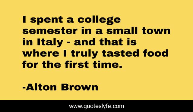 This page presents the quote "I spent a college semester in a small town in Italy - and that is where I truly tasted food for the first time.". Author of this quote is Alton Brown. This quote is about small, college, time,.