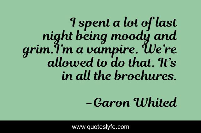 This page presents the quote "I spent a lot of last night being moody and grim.I’m a vampire. We’re allowed to do that. It’s in all the brochures.". Author of this quote is Garon Whited. This quote is about brochure, moody, vampire, grim,.