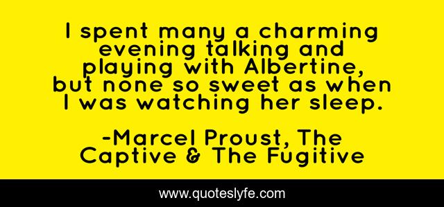 This page presents the quote "I spent many a charming evening talking and playing with Albertine, but none so sweet as when I was watching her sleep.". Author of this quote is Marcel Proust, The Captive & The Fugitive. This quote is about sleeping, sleep, sleeping-beauty,.