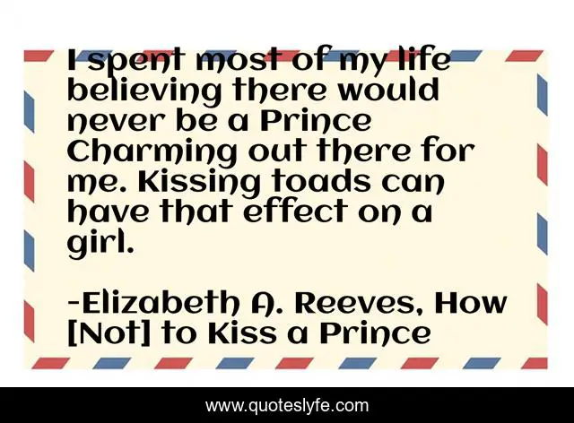 This page presents the quote "I spent most of my life believing there would never be a Prince Charming out there for me. Kissing toads can have that effect on a girl.". Author of this quote is Elizabeth A. Reeves, How [Not] to Kiss a Prince. This quote is about romance, humor, witches,.