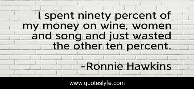 This page presents the quote "I spent ninety percent of my money on wine, women and song and just wasted the other ten percent.". Author of this quote is Ronnie Hawkins. This quote is about money, wine, song,.