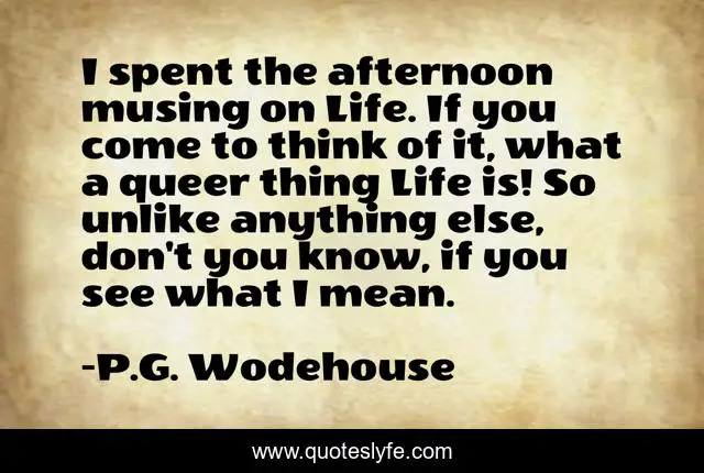 This page presents the quote "I spent the afternoon musing on Life. If you come to think of it, what a queer thing Life is! So unlike anything else, don't you know, if you see what I mean.". Author of this quote is P.G. Wodehouse. This quote is about existentialism, life, humor, pondering,.