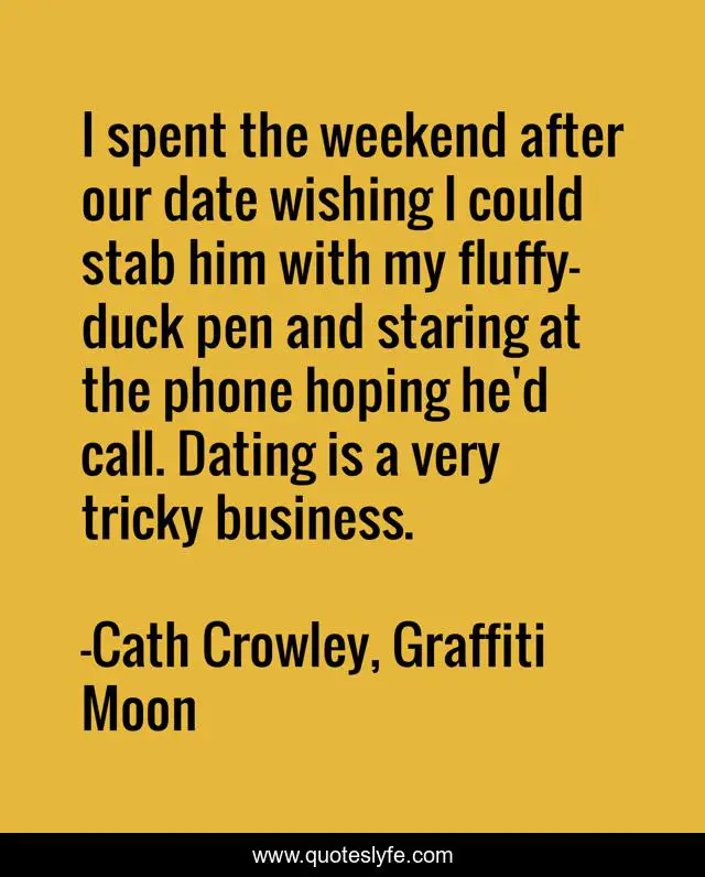 This page presents the quote "I spent the weekend after our date wishing I could stab him with my fluffy-duck pen and staring at the phone hoping he'd call. Dating is a very tricky business.". Author of this quote is Cath Crowley, Graffiti Moon. This quote is about teen, dating,.