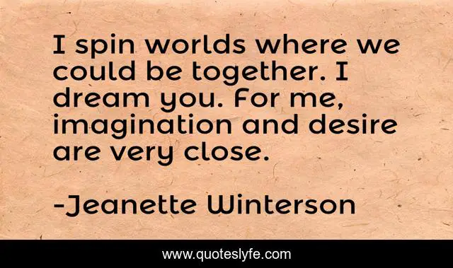 This page presents the quote "I spin worlds where we could be together. I dream you. For me, imagination and desire are very close.". Author of this quote is Jeanette Winterson. This quote is about desire, imagination, dream,.