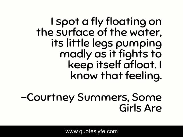 This page presents the quote "I spot a fly floating on the surface of the water, its little legs pumping madly as it fights to keep itself afloat. I know that feeling.". Author of this quote is Courtney Summers, Some Girls Are. This quote is about fly, feeling,.