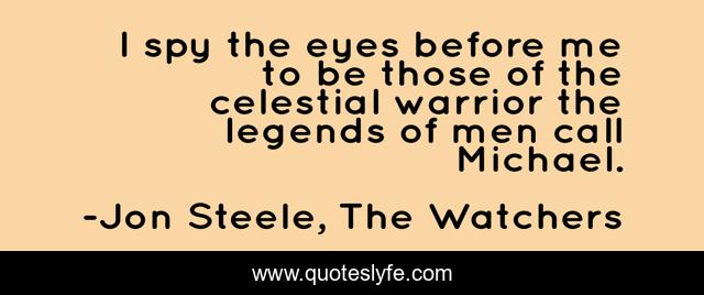 This page presents the quote "I spy the eyes before me to be those of the celestial warrior the legends of men call Michael.". Author of this quote is Jon Steele, The Watchers. .