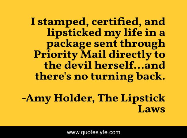 This page presents the quote "I stamped, certified, and lipsticked my life in a package sent through Priority Mail directly to the devil herself...and there's no turning back.". Author of this quote is Amy Holder, The Lipstick Laws. .