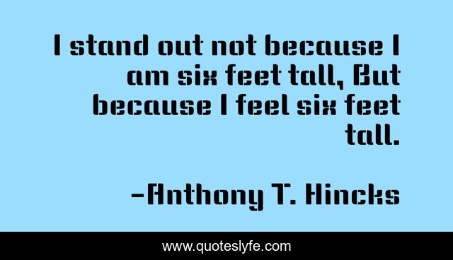 This page presents the quote "I stand out not because I am six feet tall, But because I feel six feet tall.". Author of this quote is Anthony T. Hincks. This quote is about being, me, height, self-confidence, tall,.