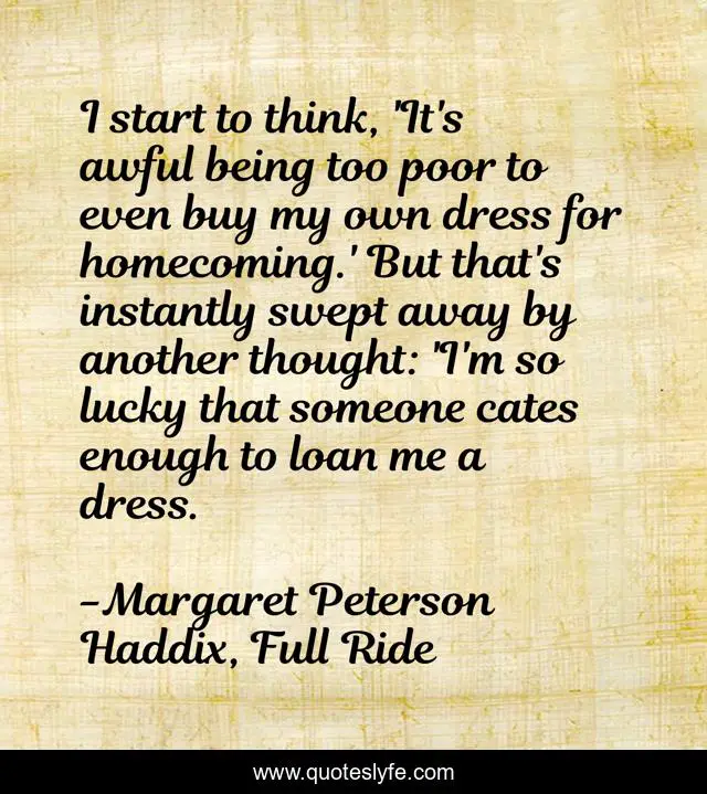 This page presents the quote "I start to think, 'It's awful being too poor to even buy my own dress for homecoming.' But that's instantly swept away by another thought: 'I'm so lucky that someone cates enough to loan me a dress.". Author of this quote is Margaret Peterson Haddix, Full Ride. This quote is about caring, viewpoint, pessimist, poverty, perspective, optimist,.