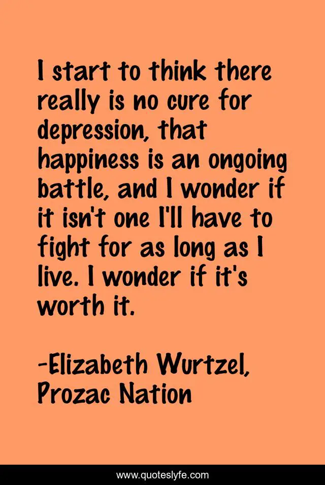 This page presents the quote "I start to think there really is no cure for depression, that happiness is an ongoing battle, and I wonder if it isn't one I'll have to fight for as long as I live. I wonder if it's worth it.". Author of this quote is Elizabeth Wurtzel, Prozac Nation. .