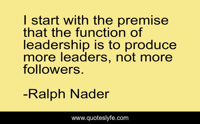 This page presents the quote "I start with the premise that the function of leadership is to produce more leaders, not more followers.". Author of this quote is Ralph Nader. This quote is about start, followers, leaders,.