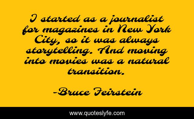 This page presents the quote "I started as a journalist for magazines in New York City, so it was always storytelling. And moving into movies was a natural transition.". Author of this quote is Bruce Feirstein. This quote is about city, transition, moving,.