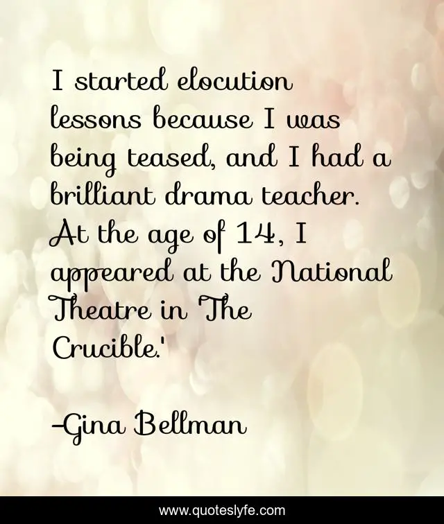 This page presents the quote "I started elocution lessons because I was being teased, and I had a brilliant drama teacher. At the age of 14, I appeared at the National Theatre in 'The Crucible.'". Author of this quote is Gina Bellman. This quote is about drama, age, theatre,.