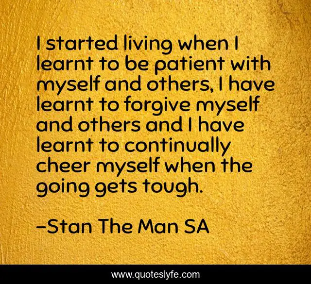 This page presents the quote "I started living when I learnt to be patient with myself and others, I have learnt to forgive myself and others and I have learnt to continually cheer myself when the going gets tough.". Author of this quote is Stan The Man SA. This quote is about commitment-and-attitude, lovequotes, inspirational, enthusiasm,.