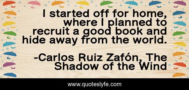 This page presents the quote "I started off for home, where I planned to recruit a good book and hide away from the world.". Author of this quote is Carlos Ruiz Zafón, The Shadow of the Wind. This quote is about home, books, reading,.