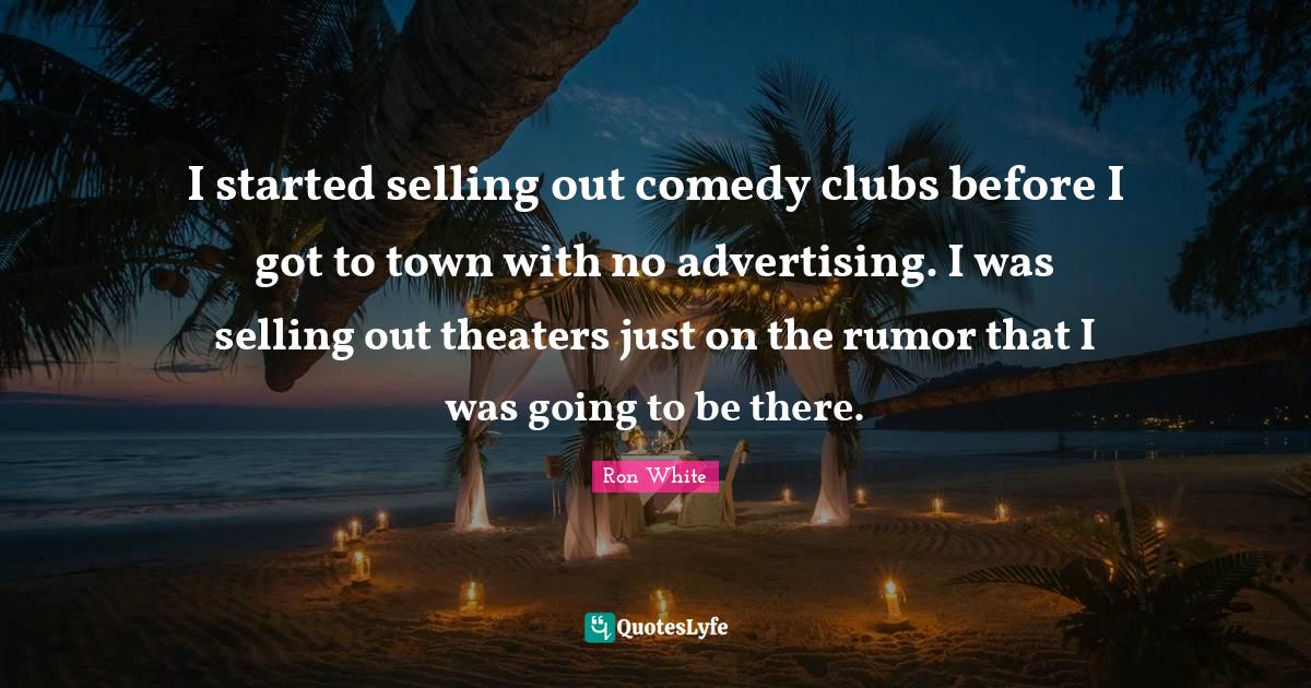 This page presents the quote "I started selling out comedy clubs before I got to town with no advertising. I was selling out theaters just on the rumor that I was going to be there.". Author of this quote is Ron White. This quote is about advertising, comedy clubs, clubs, selling out, towns, rumor,.