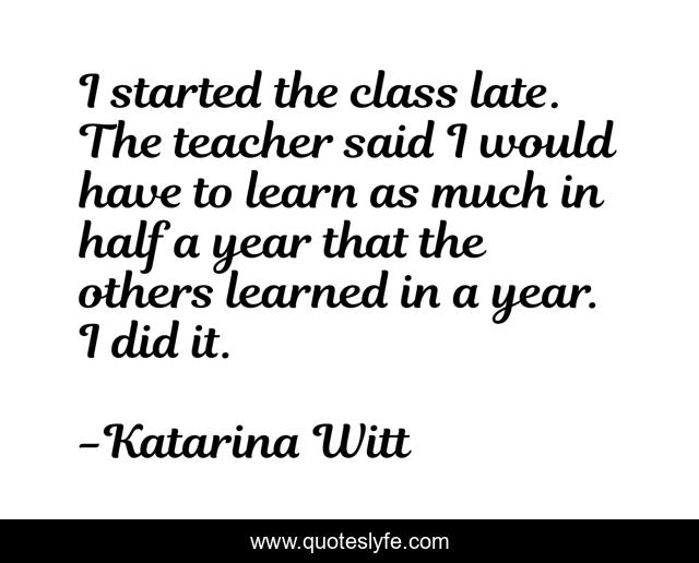 This page presents the quote "I started the class late. The teacher said I would have to learn as much in half a year that the others learned in a year. I did it.". Author of this quote is Katarina Witt. This quote is about late, said, learn,.