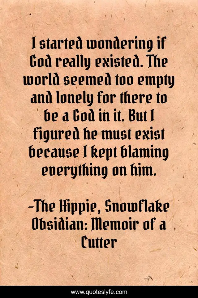 "The Hippie, Snowflake Obsidian: Memoir of a Cutter Quotes." Quoteslyfe.com, 2025. Fri. 05 Dec. 2025. <https://www.quoteslyfe.com/quote/I-started-wondering-if-God-really-existed-280118>.