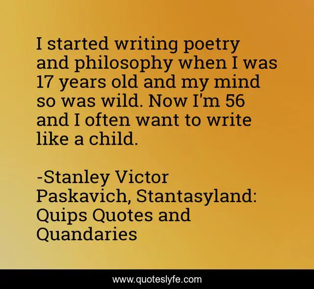 This page presents the quote "I started writing poetry and philosophy when I was 17 years old and my mind so was wild. Now I'm 56 and I often want to write like a child.". Author of this quote is Stanley Victor Paskavich, Stantasyland: Quips Quotes and Quandaries. This quote is about poems, verse, philosophy, poetry, stantasyland,.