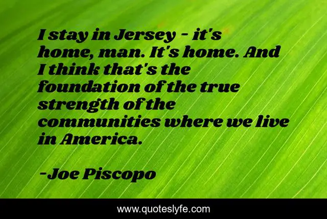 This page presents the quote "I stay in Jersey - it's home, man. It's home. And I think that's the foundation of the true strength of the communities where we live in America.". Author of this quote is Joe Piscopo. This quote is about home, america, man,.