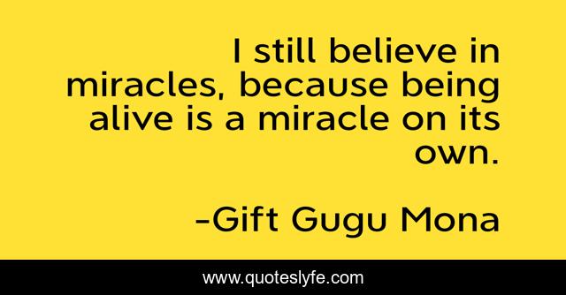 This page presents the quote "I still believe in miracles, because being alive is a miracle on its own.". Author of this quote is Gift Gugu Mona. This quote is about miracles, believe, alive, miracle,.