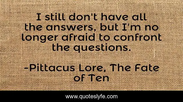 This page presents the quote "I still don't have all the answers, but I'm no longer afraid to confront the questions.". Author of this quote is Pittacus Lore, The Fate of Ten. This quote is about lorien-legacies, mgg, pittacus-lore, answers, doubt, questions, the-fate-of-ten, fear, john,.