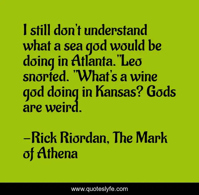 This page presents the quote "I still don't understand what a sea god would be doing in Atlanta."Leo snorted. "What's a wine god doing in Kansas? Gods are weird.". Author of this quote is Rick Riordan, The Mark of Athena. This quote is about gods, the-mark-of-athena, percy-jackson, leo-valdez, heroes-of-olympus, percy-jackson-and-the-olympians,.