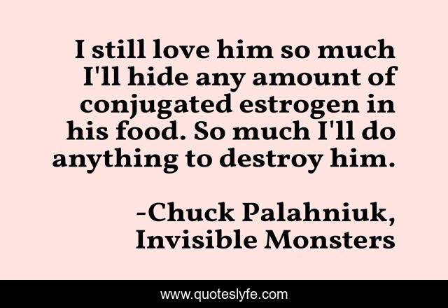 This page presents the quote "I still love him so much I'll hide any amount of conjugated estrogen in his food. So much I'll do anything to destroy him.". Author of this quote is Chuck Palahniuk, Invisible Monsters. This quote is about humor, love, affection,.